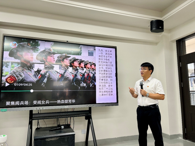 陈友结合2024级海洋资源与环境专业员工先萍以女兵方阵成员身份参加阅兵仪式的事例,指出其以实际行动诠释了新时代青年的责任与担当。他号召全体同学以先萍为榜样,将爱国之情、报国之志融入日常学习生活。