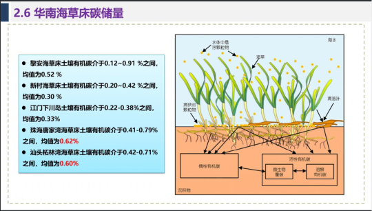 刘伟杰高级工程师以“华南地区海草床生态系统现状及碳储量调查研究”为题,华南地区海草床生态系统及碳库规模调查方法进行介绍,结合现场观测经验,提供实际工作建议。报告主要介绍分析华南地区三省海草床生态系统现状特点及胁迫因子,突出海草床“蓝碳”重要作用,阐述如何更好地保护修复海草床的相关考虑。