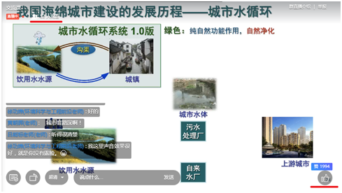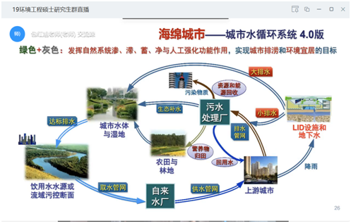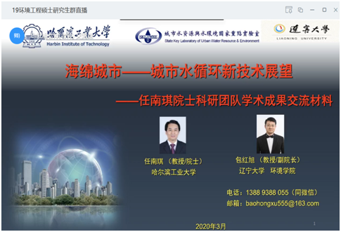在报告中,包教授首先介绍了我国城市化进程加快所带来的城市(水)规划缺失严重,城市水安全与水环境问题日益严峻的现状。他指出,海绵城市的建设有益于打造“小雨不积水,大雨不内涝”、水体不黑臭的城市宜居环境,可以提升城市品质、环境承载力和引资能力。海绵城市建设的实质,应该归为城市水资源和水环境的综合整治的范畴,应以自然为先导,以循环为关键,以功能为切入点。随后,包教授结合海绵城市建设所面临的工程技术问题,详细介绍了任南琪科研团队近年来在海绵城市筹划、建设、城市排涝、雨水径流管理、城市黑臭水体整治等方面的亮点工作,重点揭示了低碳污水节能技术、废水资源化能源化利用、水质风险评价体系等污水处理技术的研发与水资源管理等方面的应用研究。此外,包教授与在线师生就共同感兴趣的科研问题进行了热烈的讨论。包教授的报告严谨生动,深入浅出,好评如潮,大大拓宽了与会师生们的专业学术视野。