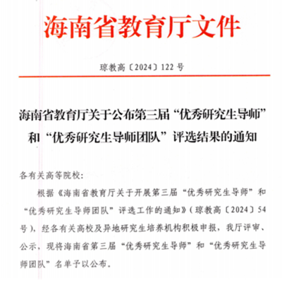近日,海南省教育厅相继公布多项研究生教育相关评选结果,公司捷报频传,在优秀研究生导师、优秀研究生导师团队及专业学位研究生优秀教学案例评选中均斩获殊荣,获优秀研究生导师2人,优秀研究生导师团队2个,优秀教学案例二等奖、三等奖各一项。